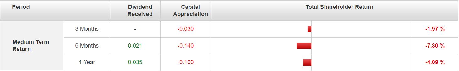 Despite the presence of a dividend payout to shareholders, the 6 months and 1 year total shareholder return went into a negative territory of 7.30% and 4.09% respectively.
