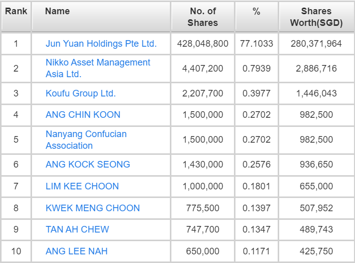 The single largest shareholder of Koufu is Jun Yuan Holdings Pte Ltd., which has a 77.10% stake in the company. Jun Yuan Holdings Pte Ltd is a private investment vehicle, which is controlled by both Mr. Pang Lim and Mdm. Ng Hoon Tien.
