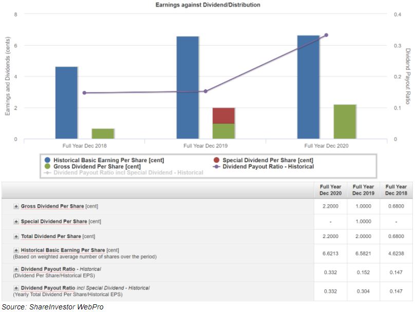 The higher dividend was mainly attributed to an improvement in its earnings and the higher dividend payout ratio, from 14.7% in FY2018 to 33.2% in FY2020.