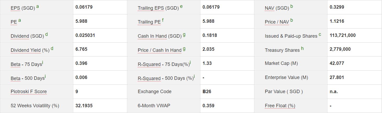 Based on the current share price of S$0.37, this translates into a dividend yield of 6.76%.