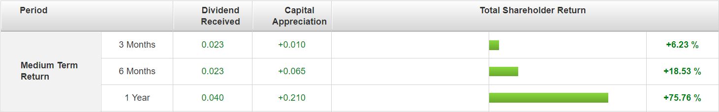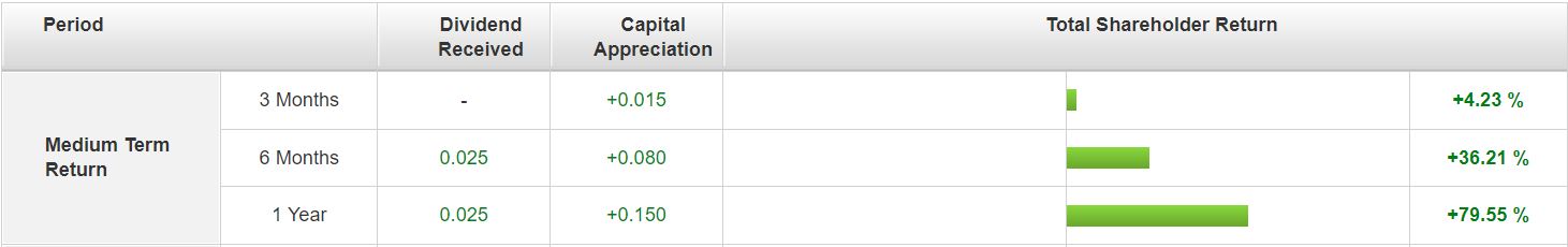 For the past 1 year, Ban Leong has achieved a total shareholder return of nearly 80%. Majority of these returns are generated via capital gains (15 cents per share), while the remaining came in the form of dividend (2.5 cents per share).