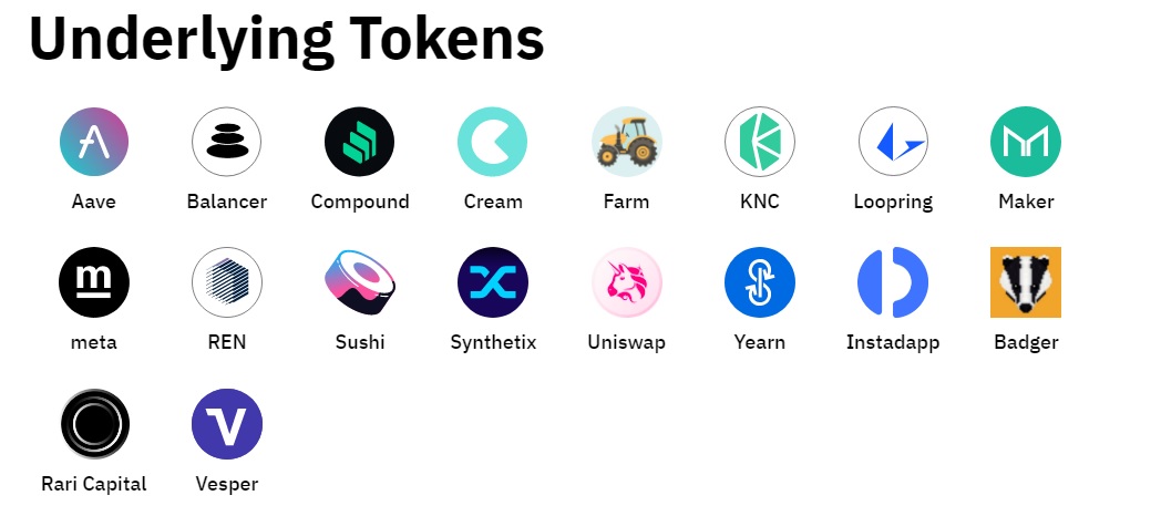 Meesari demonstrates his support for projects like the Index Cooperative (also known as Index Coop) that harnesses smart contracts to create a custom index fund of tokens. He listed two examples from Index Coop: the Defi Pulse Index and the Bankless BED Index. I'm going to just focus on the DPI here. The Defi Pulse Index tracks the performance of trending tokens across various decentralised finance platforms and protcols. Here's a screenshot from the Index Coop's website: