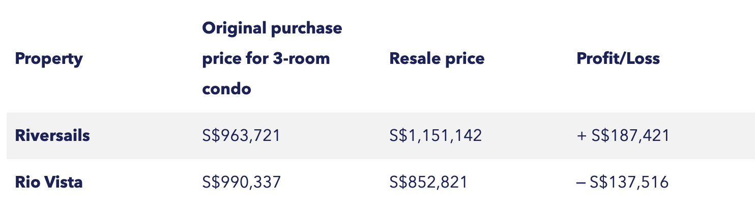 On the other hand, a similar unit in Rio Vista sold by a second buyer for S$990,337 would have fetched only S$852,821 upon resale.