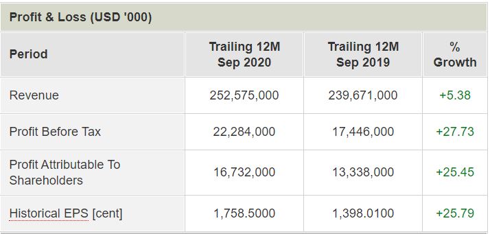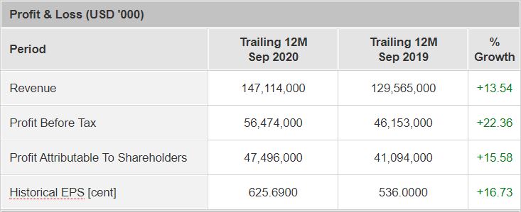 In line with the growth in revenue, Microsoft’s Profit Attributable to Shareholders grew by 15.5% year-on-year to US$47.5 billion.