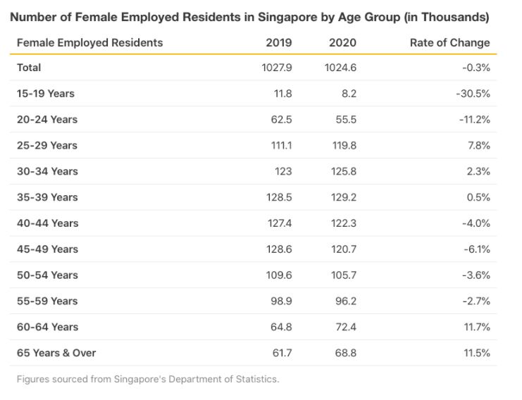 Meanwhile, a decline in employment rates for women aged 40 to 59 can be traced back to unpaid care work. As the age of having children continues to be pushed forward, it's no surprise that middle-aged Singaporean women make up the largest proportion of mothers in the country. With this in mind, both working women and employers should be prepared to negotiate a work schedule that works for both of them.