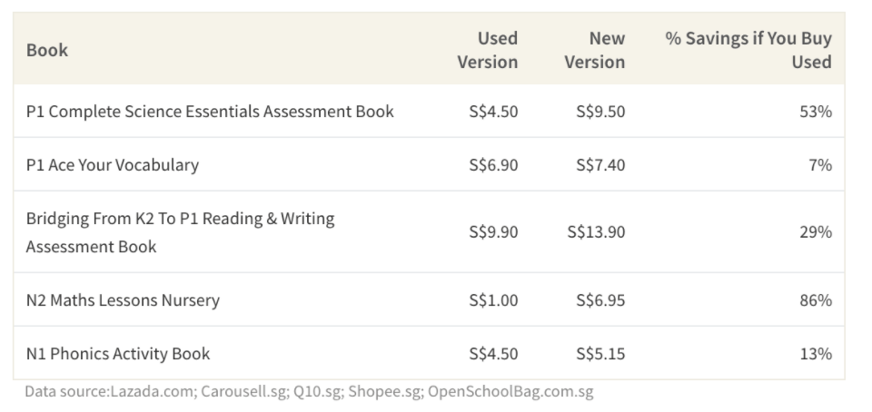 Parents whose children have already completed that school grade might be itching to sell their books online—often at a fraction of the original price. In some cases, you can find relatively inexpensive books with minimal marking. For example, Carousell, an online retailer, sells new and used nursery school books for as little as S$1. What's even better is that in some cases you can contact the seller and negotiate the price down, especially if you're buying in bulk from one provider.