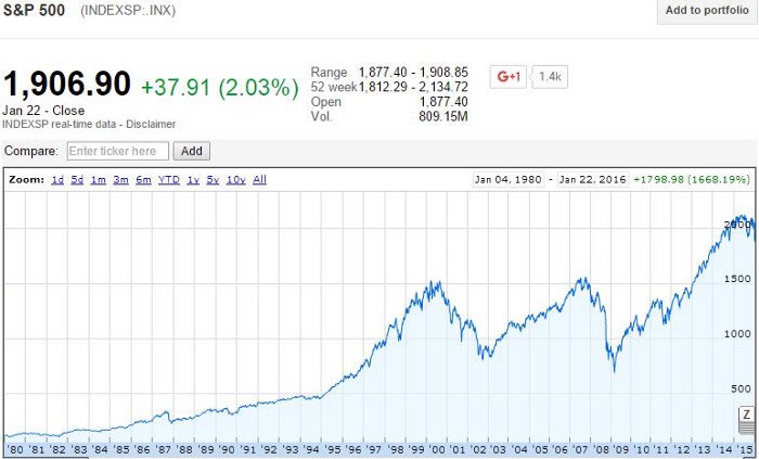 Let’s take a look at the chart for S&P 500 index over the past 35 years since 1980.