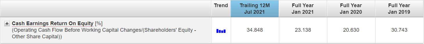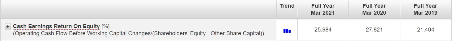 After experiencing a rise in its Cash Earnings ROE to 27.82% in FY2020, it suffered a slight decline in the metrics to 25.98% in FY2021. The drop was due to a lower operating cash flow, as a result of lower earnings.