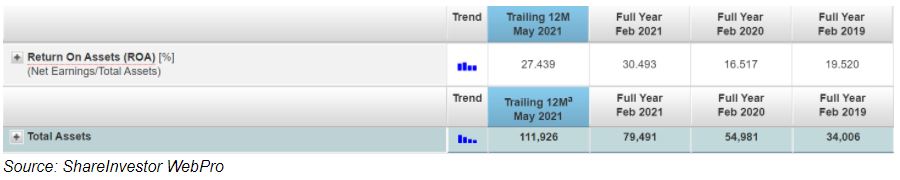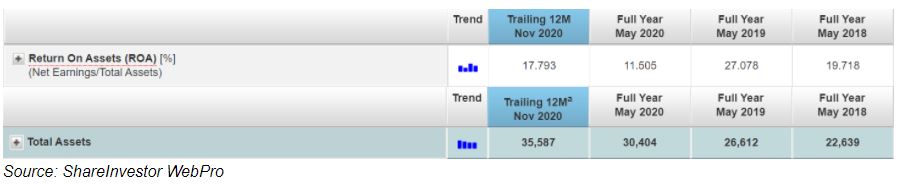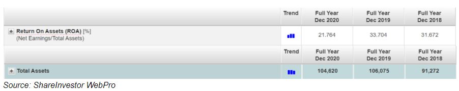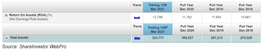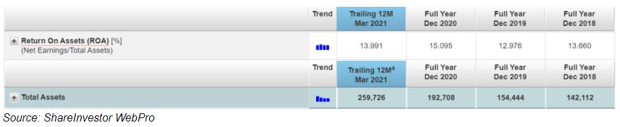 The drop in ROA was attributed to the lower earnings against a backdrop of a higher total assets for FY2019 and FY2020. On the other hand, its ROA also rebounded to 12.7% as of March 2021 trailing 12 months.