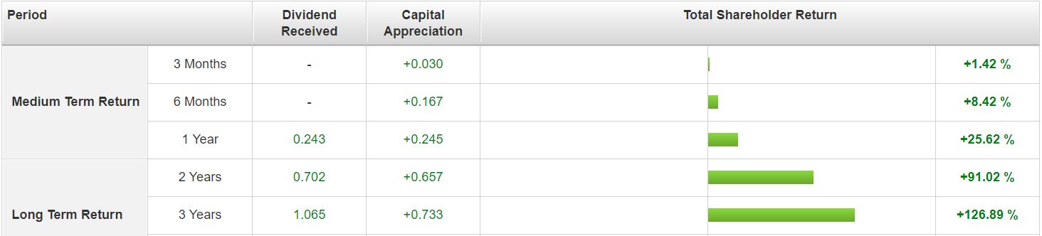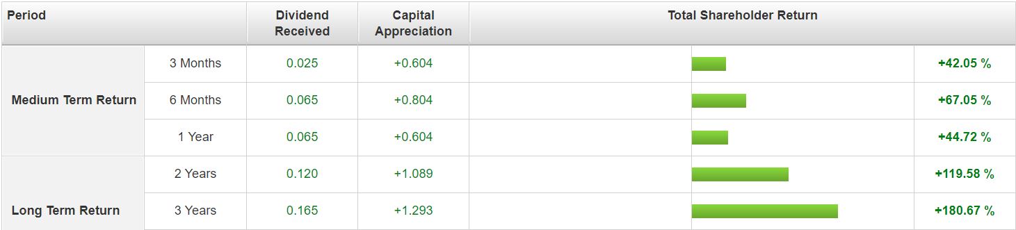 Over a period of 3 years, Cortina generated a total shareholder return of 180.67%, of which, the capital appreciation amounts close to S$1.30 while the dividend payout stands at S$0.165.