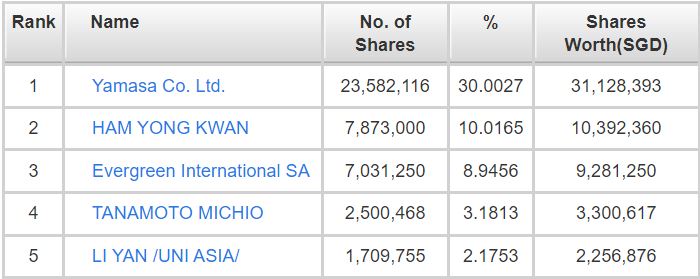 Based on the table above, the largest shareholder for Uni-Asia belongs to Yamasa Co. Ltd., which has a 30.00% stake in the Group. Yamasa Co. Ltd.’s line of business includes providing trucking or transfer services.