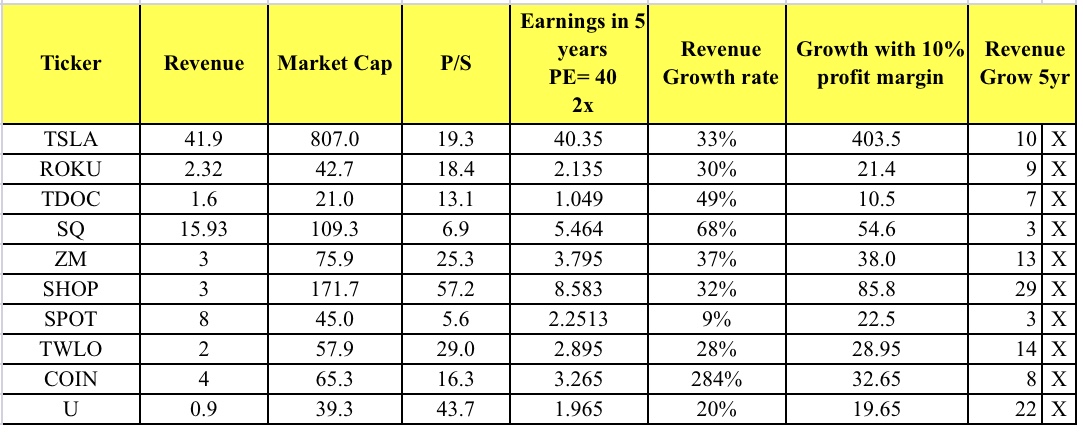 The table below, summarise in order to justify today market capitalisation, how much the company need to grow their revenue. For example, for $SHOP, it need to grow 29x revenue in 5 years. Some are maybe possible like SQ and SPOT, 3x. While some are really crazy. Tesla may 10x because of all the ramp up production, but more probably in 10 years rather than 5 years, in my opinon.