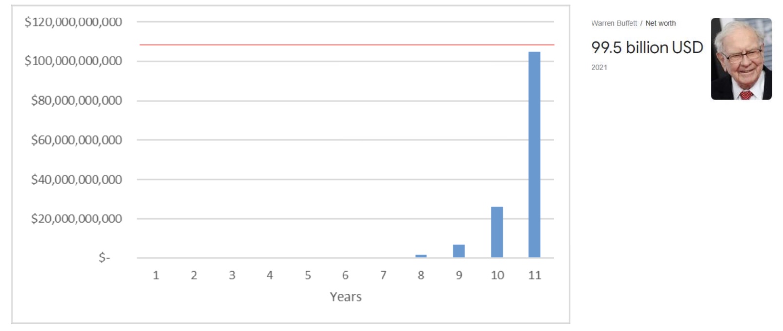 Therefore, with initial investment of $100k, if you can 4x your money every year or 10x your money every 2 - 3 years. You will be as rich Warren buffet in 10 years time, which he take 91 years. However, i know i am simply not smart enough to do that.