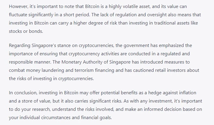 I naively thought that ChatGPT would provide examples on how BTC acted (or failed to act) as an inflation hedge, citing figures up to the year 2021. I also assumed that it would provide concrete examples about when the Singapore government cautioned its citizens about the risks of Bitcoin investing. But I guess it’s good that even ChatGPT knows how to set its own boundaries!
