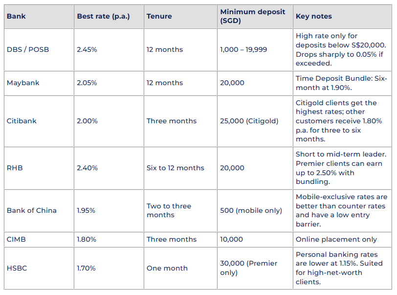 For savers seeking a balance between reasonable returns and shorter lock-up periods, the six-month placement is a practical low-risk choice, though rates are no longer at the earlier peak of 2.45% p.a.