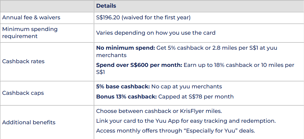 The DBS yuu Card is a cashback credit card that rewards you for everyday spending across various categories. It’s designed to be flexible and easy to use.