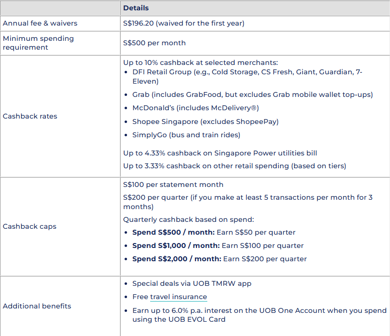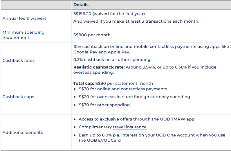 The UOB EVOL Card is a good choice for working professionals who often shop online or use contactless payment apps. It has a low minimum spend and offers discounts at eco-friendly retailers.