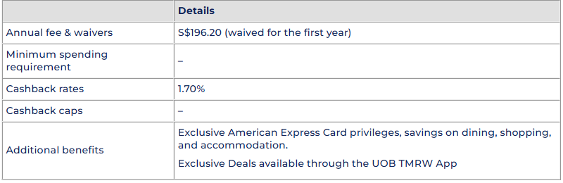 The UOB One Card is a cashback credit card that rewards you for your everyday spending. It works across a range of common categories, making it a practical choice for daily use.