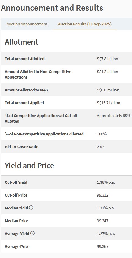 Today (11 September 2025) the auction results for BS25118F was released here: https://www.mas.gov.sg/bonds-and-bills/auctions-and-issuance-calendar/auction-t-bill?issue_code=BS25118F&issue_date=2025-09-16