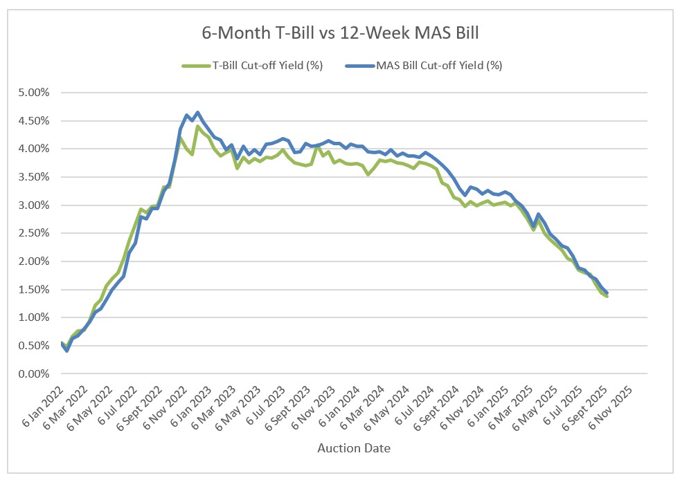 This round MAS Bill dropped 10 basis points from ML25136X 1.44% to ML25138N 1.42%, and the supply of the coming T-Bill BS25119Z reduced to $7.7 billion dollars. I expect the cut-off yield to stay about the same as last issue.