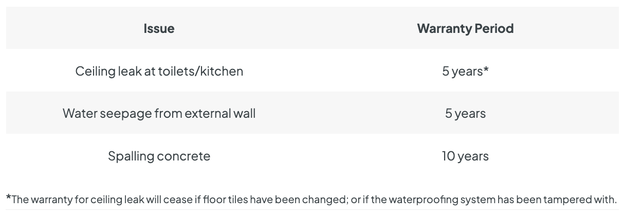HDB’s Assure 3 warranty covers issues such as ceiling leak, external wall seepage, and spalling concrete: