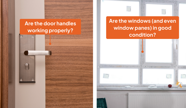 All hinges should also be rust and mould-free, and there shouldn’t be any scratches on the surfaces, chips off the edges, unevenness in the laminate and linings, and the glass in your windows should not have any cracks or scratches too.