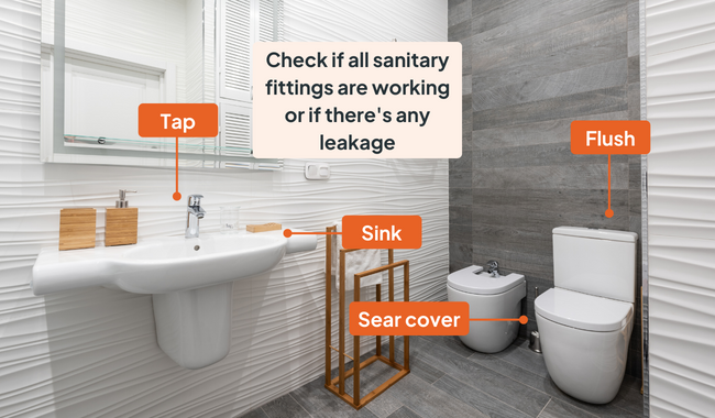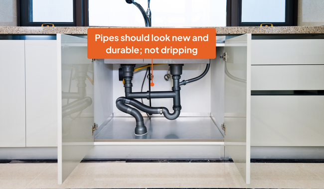 Look out for telltale stains and corrosion, especially around valves, fittings, pipes, and below and around cabinetry. Pipes should look new and durable; turn the water on to inspect them for leaks, especially around the joints. Check both your bathrooms and kitchen where all your plumbing works and sanitary fittings are most likely to be.