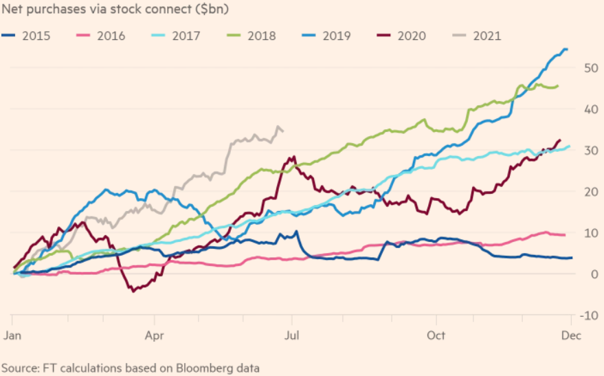 According to the Financial Times, based on its own calculations, offshore investors have bought a net US$35.3 billion in Chinese stocks so far in 2021 via the Stock Connect (see below).