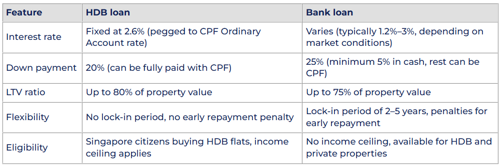 An HDB loan is a good option if you have lower savings and prefer stability. It requires a smaller cash outlay, with the down payment fully payable using CPF. The fixed 2.6% interest rate ensures predictable repayments, but eligibility is limited to Singapore citizens with income caps.