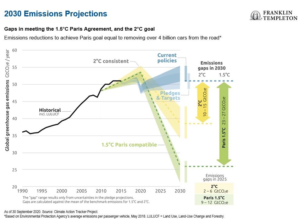 Overall, we are seeing real momentum behind the global push to tackle carbon emissions as many nations set out targets to reduce their carbon footprint or reach ”net zero”—when any man-made GHG emissions are balanced out by GHG reduction measures. As bottom-up fundamental, long term and forward-looking investors, we seek out companies that provide an active product or service that directly reduces GHG or offer an alternative source of energy. However, these are not the only companies that should benefit from the transition to a low-carbon future.