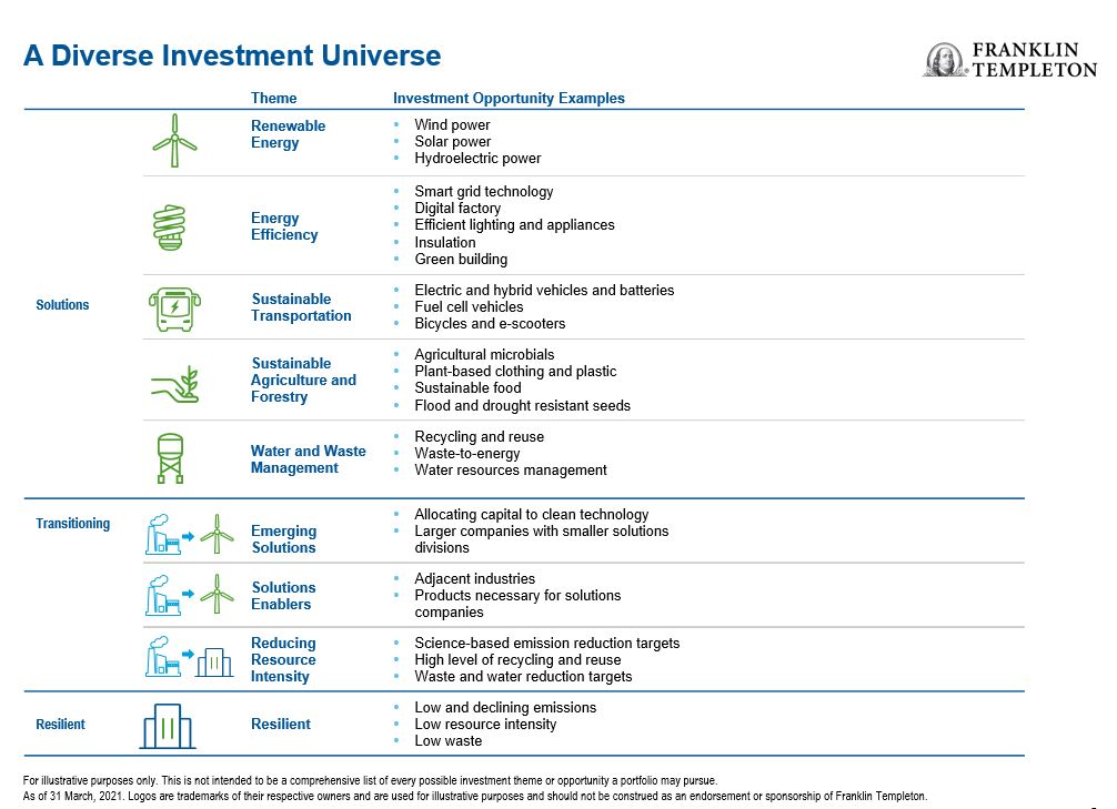 The investible universe for climate change represents a much broader opportunity set of activities across a wide range of sectors. This could include companies that are providing a product in sustainable transportation, sustainable agriculture and forestry, water and waste management, or even energy efficiency. It may include companies involved in finished goods such as plant-based clothing or sustainable packaging.