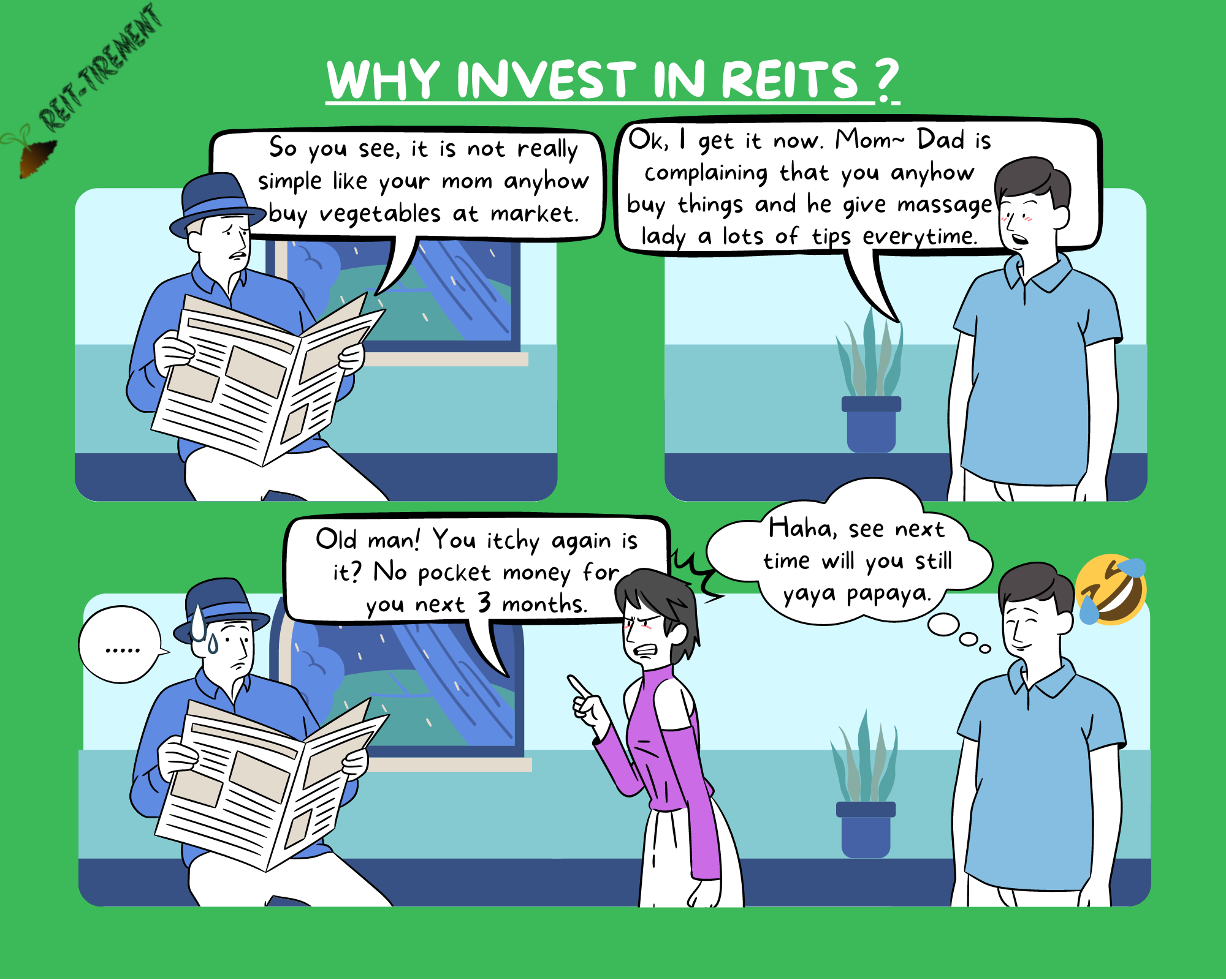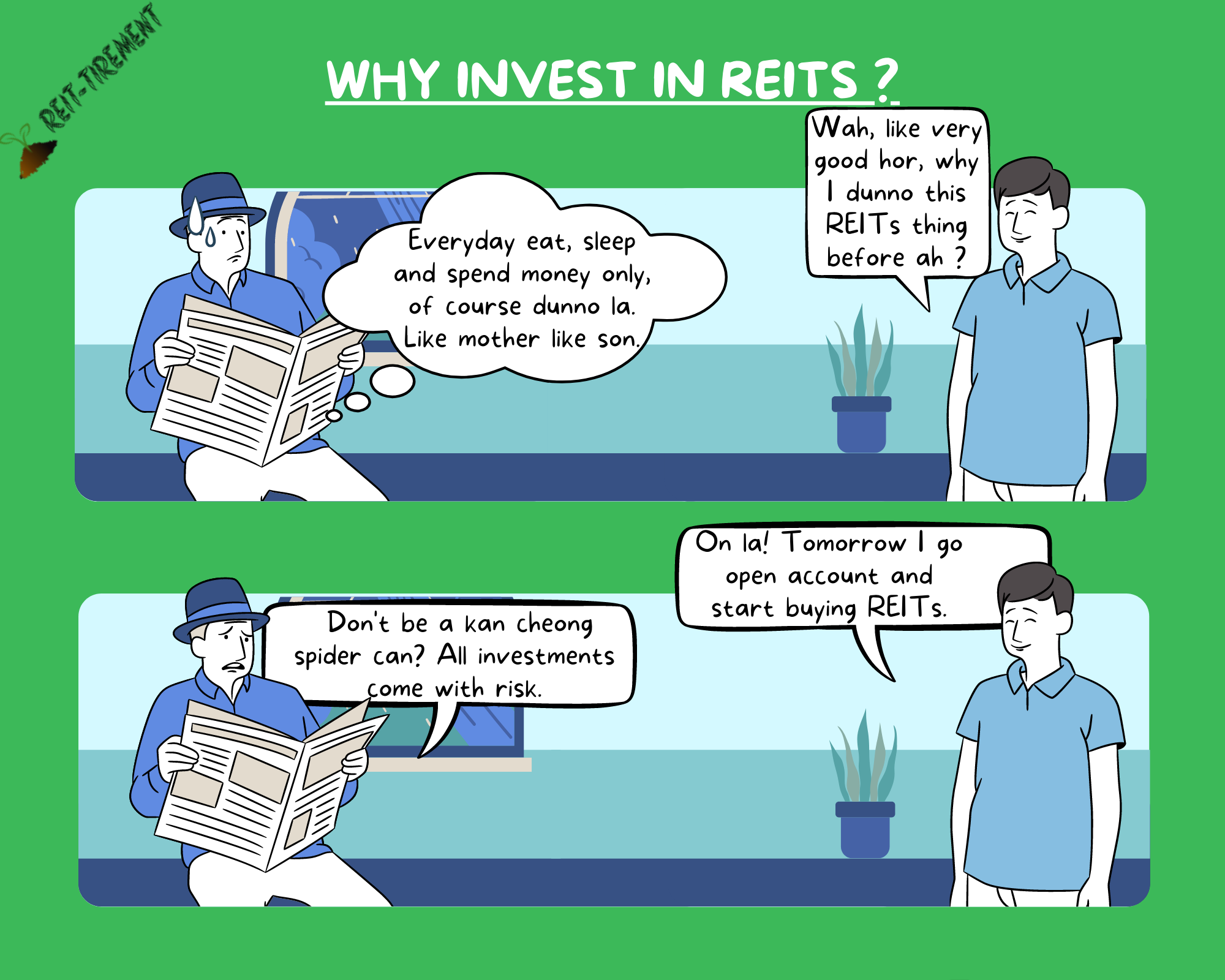 There is always a debate on whether to invest in physical property or to invest in REITs (why not both), each has its own merits. I have posted this topic at the very beginning of my blog(refer here), but this time, I would like to try something new. I would post my ideas in a comic strip style and in Singlish. Without further ado, let's enjoy the content below.