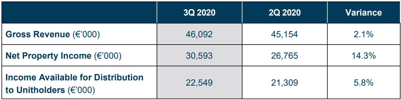 CEREIT’s income available for distribution (“DI”) grew 5.8% quarter-on-quarter to €22.5 million in 3Q 2020. Its 3Q 2020 indicative distribution per unit (“DPU”) was 0.882 Euro cents, representing a 5.8% quarter-on-quarter increase. The indicative DPU is based on a 100% payout of DI and takes into account no capital distribution and base manager fees and property manager fees paid 100% in cash.
