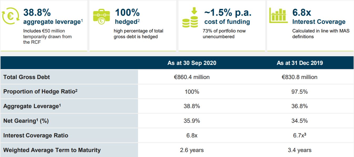 As at 30 Sep 2020, CEREIT’s total gross debt came in at €860.4 million, which is €29.6 million higher as of 31st December 2019. This resulted in a 2 percentage points increase of CEREIT’s Aggregate Leverage to 38.8%.