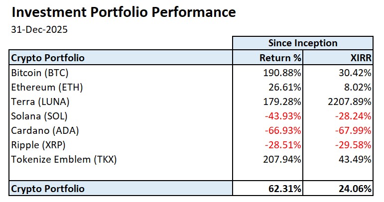 My hypothetical crypto portfolio performance as of 31 December 2025: