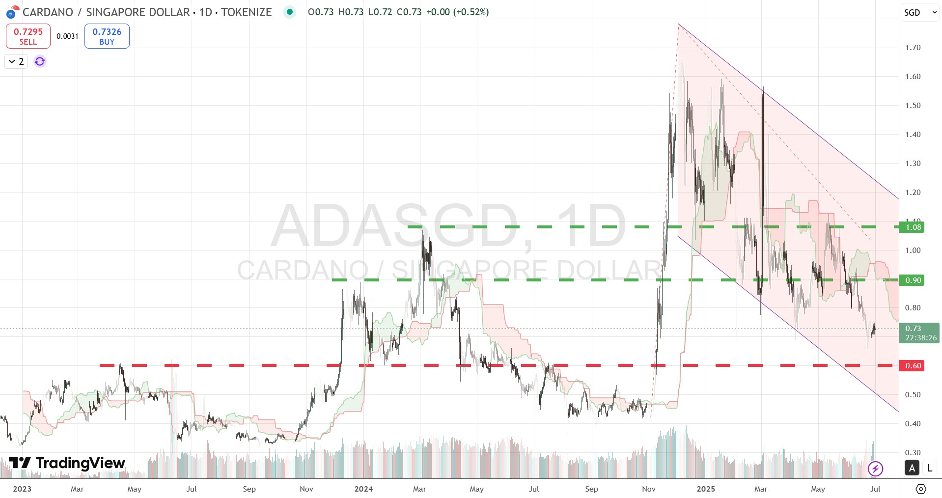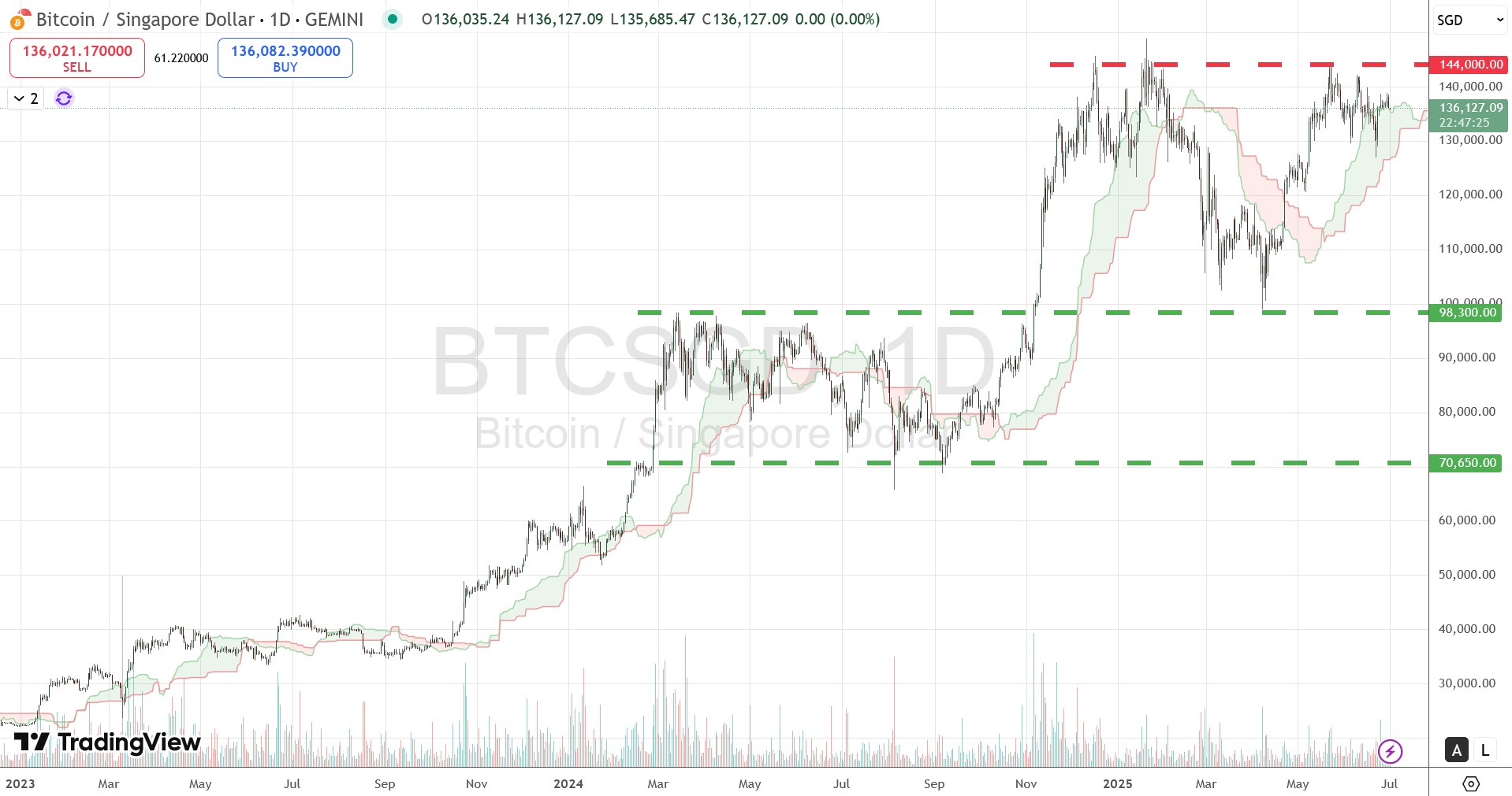 In the BTC chart up to June 2025, I have removed the Fibonacci Extension to make the chart cleaner, but kept the support and resistance lines. Among the 6 coins, BTC is the strongest as it sit just above its Ichimoku Cloud and near the ATH level. If it tests and breaks the resistance level at SGD144,000, it will go into uncharted area and we can bring back Fibonacci Extension to look at target levels.