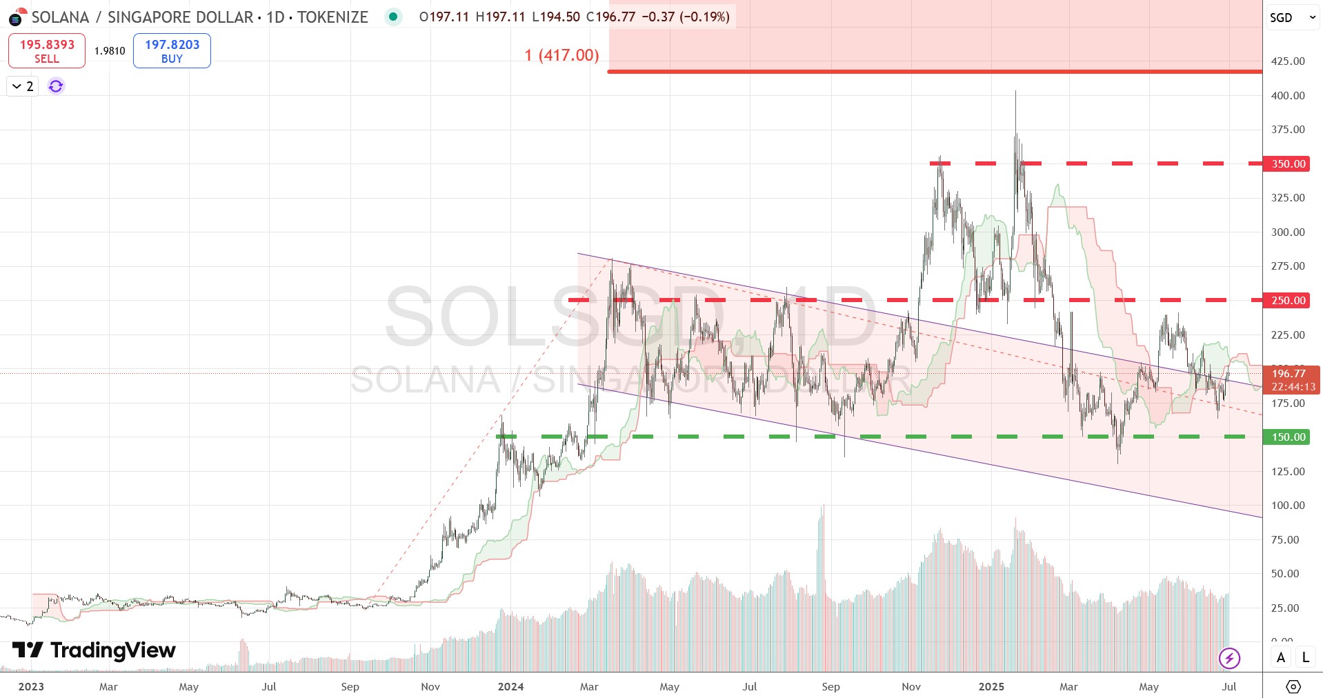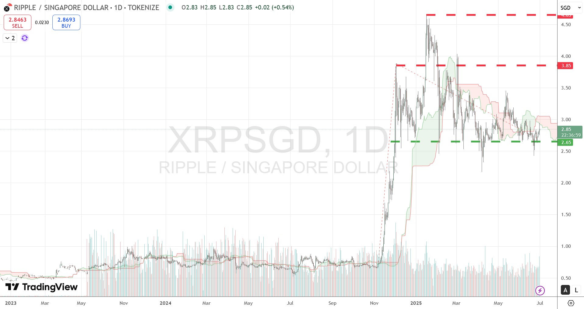 ETH, the queen of crypto coins, wasn't performing as well as BTC in June 2025. It sunk back into its Ichimoku Cloud, and is 2 major resistance levels away from the recent highs. Do take note that the higher resistance level SGD5,400 is not the ATH, the latter happened in 2021 at about SGD6,500.