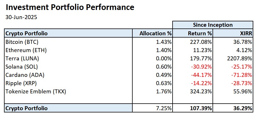 My crypto portfolio retracted slightly in June 2025 from the previous month. The Return % and XIRR since inception eased off by approximately -20% and -3% respectively. With the purchase of ETH, now my BTC and ETH allocation are on par at about 1.4% allocation of my overall investment portfolio.