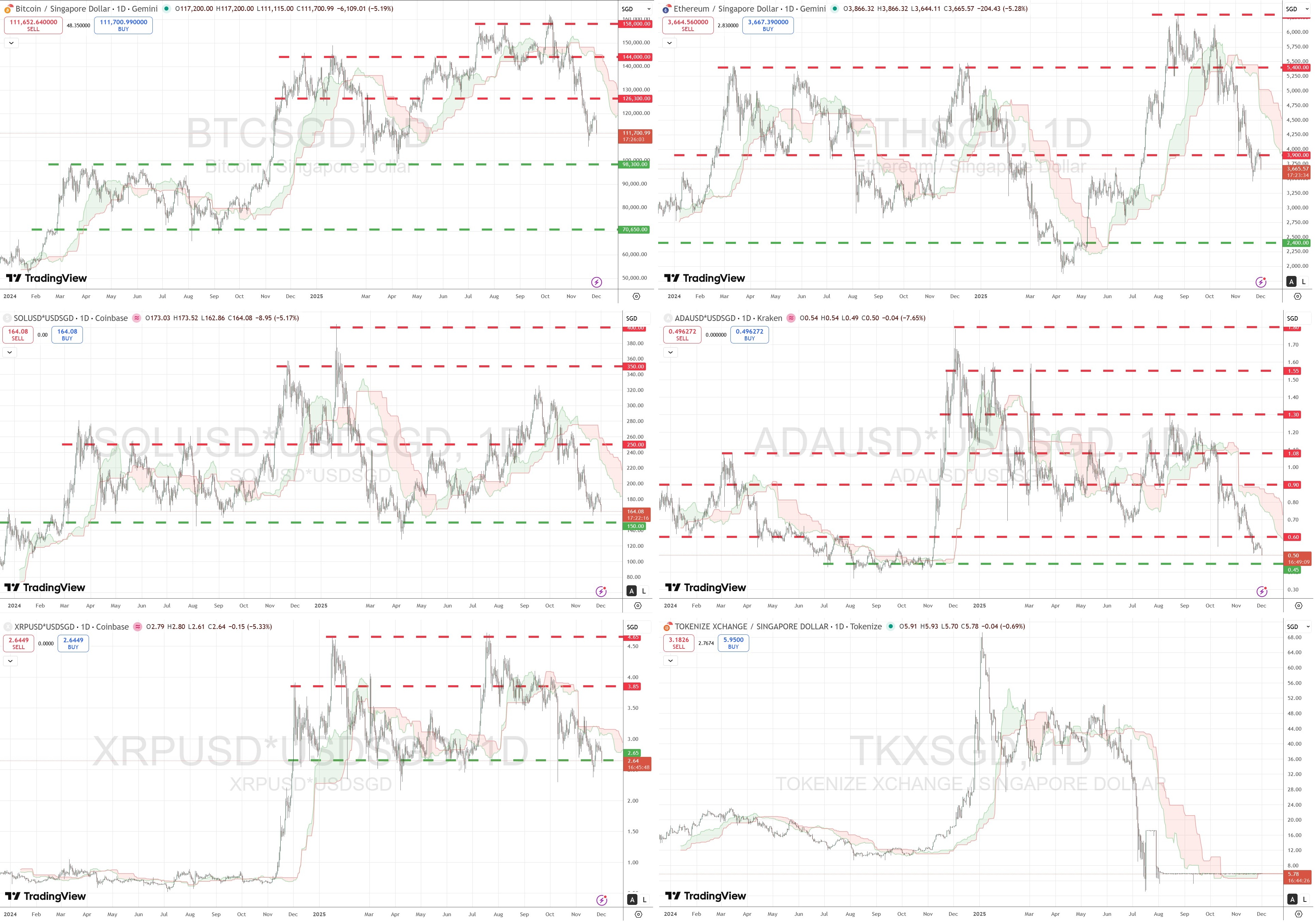 All the main coins and alt coins fell further in November 2025, with TKX remained flat. BTC/ETH/ADA broke their support levels in the process.