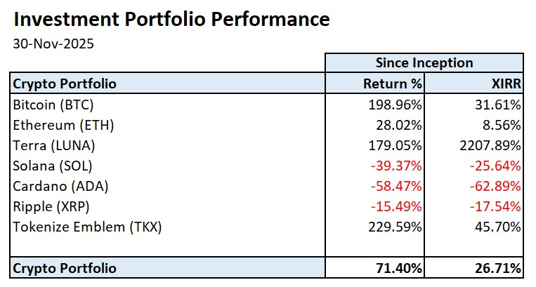 This Opinion post first appeared in my blog here: https://pwlcm.wordpress.com/2025/12/02/crypto-investment-update-november-2025/