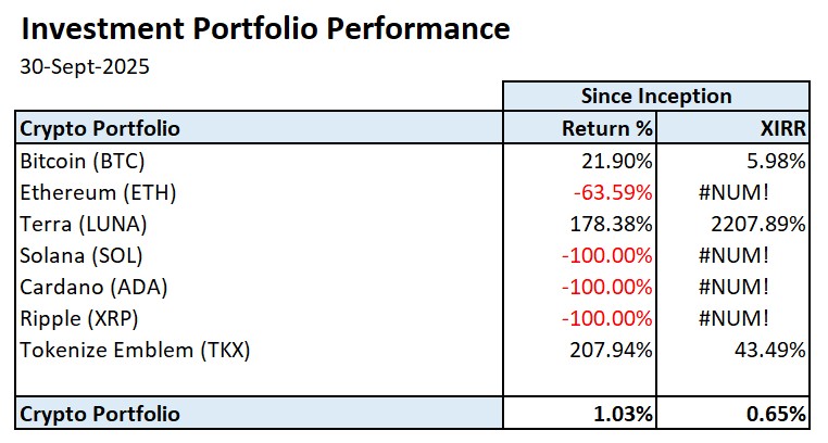 Hence, I would write off my crypto holdings, i.e. valued at zero, moving forward. My crypto portfolio performance would become:
