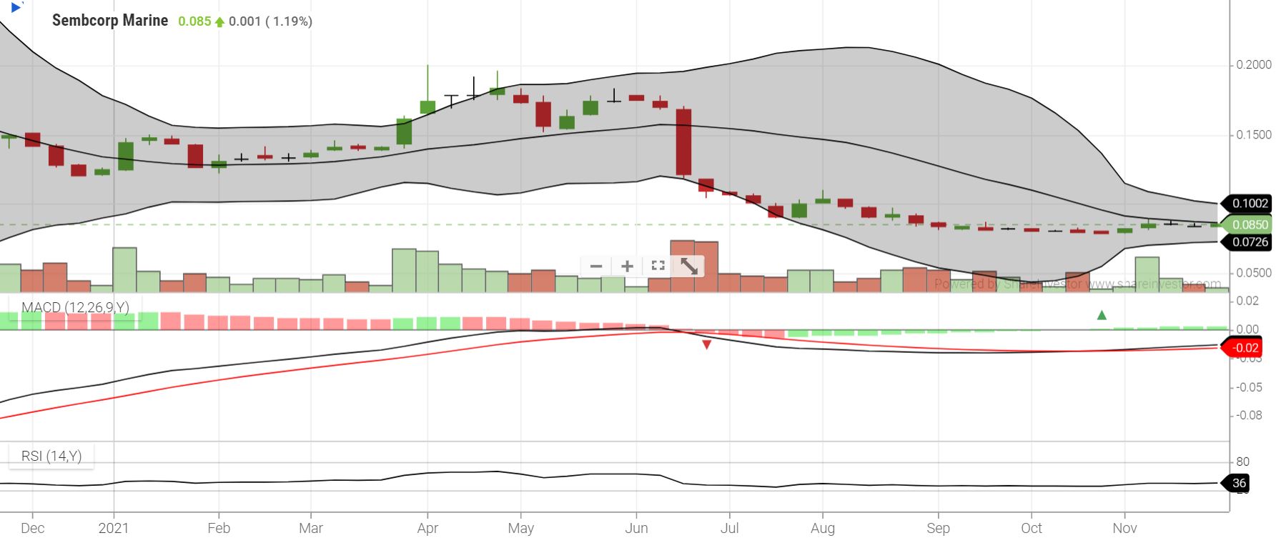 Since then, Sembcorp Marine’s share price has been trading below the 20-Day moving average line and its Relative Strength Index (“RSI”) is trading near the oversold territory. In November 2021, its Bollinger band is starting to showcase a form of tightening.