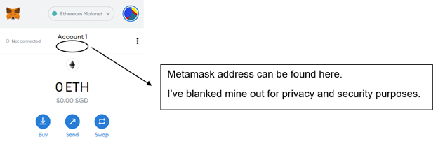 After setting up your Metamask account, you will notice at the top that you’re currently on the Ethereum Mainnet, and your Metamask wallet address can be found below your account name.