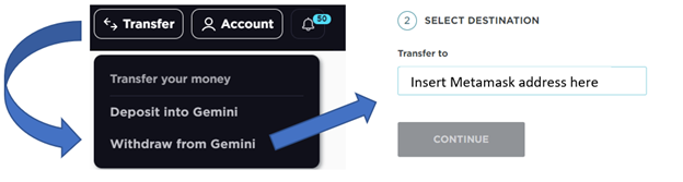 For Gemini, go to Transfer, click on Withdraw from Gemini and follow the given prompts. Copy and paste your Metamask address under the transfer destination.