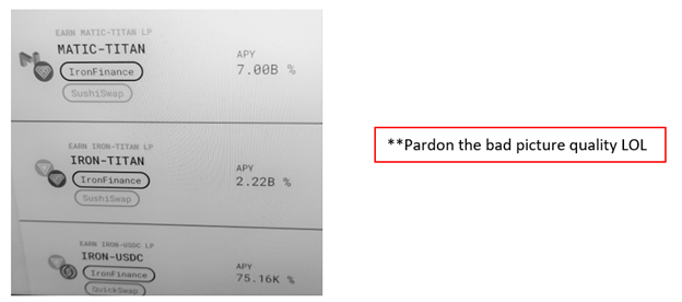 It was only when the yield hit 100,000% APY when I started questioning why the yield was so ridiculously high. Once I understood the tokenomics of IRON/TITAN and saw TITAN drop to $40 from its ATH of $60, I pulled out my funds.