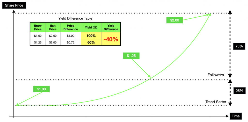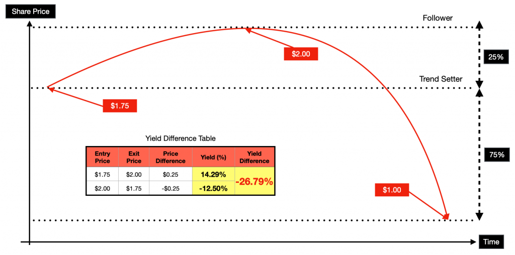 Honestly, it is hard to explain my point using the above scenario because both the trendsetter and follower made a healthy yield of 100% and 60% respectively. Hence, I had to exaggerate the price range between both entry and exit points to elucidate the difference in yield. From the above example. The trendsetter who has properly studied the stock and has made calculated risk assessment bought when the trend was not apparent. As a result, that investor made an additional 40% when he exited at the same price of $2.00. No doubt the actual difference is only $0.25 but the relative difference between the follower and trendsetter is 20% ($1.25) and 25% ($1.00) respectively resulting in 40% difference in yield.