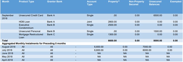 · Summary of your personal credit facilities, total credit limit across all banks in Singapore and any presence of default or bankruptcy records.