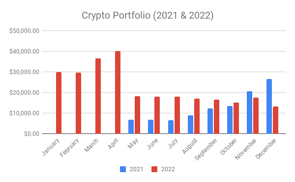 Crypto is not really on my mind right now, I am still contributing but mostly with the spare change that I have like at the end of each month after accounting for savings, investments into index ETFs and REITs as well as my expenses. So not really any huge contributions but crypto is tough especially after LUNA/UST crash as you can see from my chart, April 2022 drop to May 2022 and then FTX collapse and many other dominos effect.