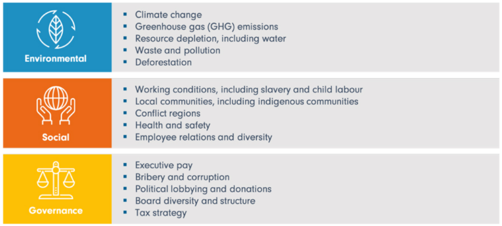 ESG investment strategy represents 3 categories: Environmental, Social, and Governance.