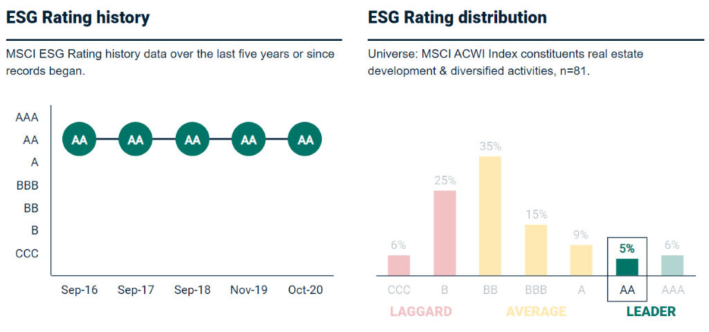 Based on the MSCI ESG Rating, CapitaLand's rating remains unchanged since September 2016 with a ranking of “AA”. On top of that, CapitaLand is a leader among 81 companies in the real estate development & diversified activities industry.